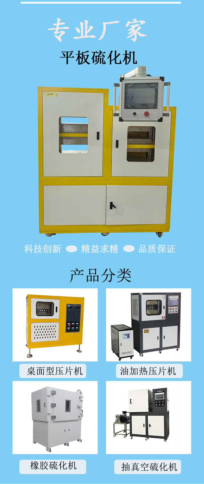 壓片機又名平板硫化機,主要用于硫化平型膠帶(如輸送帶、傳動帶,簡稱平帶),屬于液壓機械,平板硫化機的主要功能是提供硫化所需的壓力和溫度。壓力由液壓系統(tǒng)通過液壓缸產(chǎn)生,溫度由加熱介質(zhì)(通常為蒸汽、導(dǎo)熱油等,過熱水也有用)所提供。輸送帶平板硫化機主要用于硫化平型膠帶、膠板、高分子等平板類產(chǎn)品的成型,它具有熱板單位面積壓力大,設(shè)備操作可靠、維修量少等優(yōu)點。溫度由加熱介質(zhì)(通常為蒸汽、導(dǎo)熱油等)所提供。 平帶平板硫化機按機架的結(jié)構(gòu)形式主要可分為柱式平帶平板硫化機和框式平帶平板硫化機兩類;按工作層數(shù)可有單層和多層之分:按液壓系統(tǒng)工作介質(zhì)則可有油壓和水壓之分。
